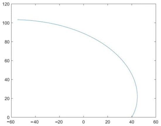The blade profile can be obtained by substituting β1 = 25°, β2 = 30°, D1 = 80, and φ = 120° into Equation (1). In total, 50 fitting points are selected, and the blade profile obtained is plotted using MATLAB R2019a software, where the ordinate and abscissa represent the coordinates of the fitting points, as seen in Figure 2.