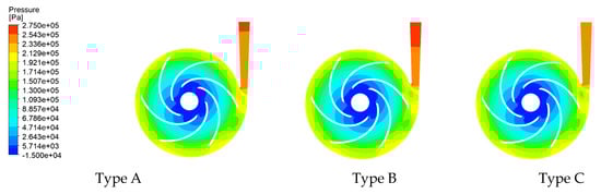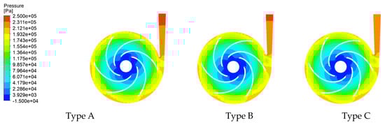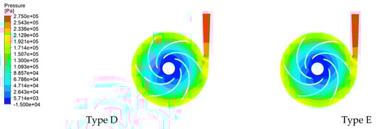 Under this condition, the static pressure distribution in the impeller passage of the single-tongue volute centrifugal pump and the double-tongue volute centrifugal pump is similar []. For each model pump, the minimum static pressure appears at the inlet of the impeller, and the minimum static pressure is −33,210.3 , −32,642 , −32,911.5 , −32,556.3 , and −31,447.1 , respectively. With the continuous rotation of the impeller, the static pressure value gradually increases and reaches a more significant value at the outlet of the impeller.