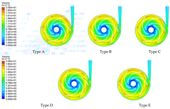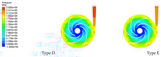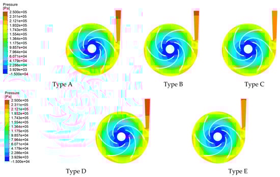 Under this condition, the static pressure distribution in the impeller passage of the single-tongue volute centrifugal pump and the double-tongue volute centrifugal pump is similar []. For each model pump, the minimum static pressure appears at the inlet of the impeller, and the minimum static pressure is −31,102.4 , −31,160.0 , −32,147.1 , −34,339.8 , and −30,345.9 , respectively. As the rotating fluid of the impeller begins to enter the interior of the pump, the static pressure value gradually increases and reaches a more significant value at the outlet of the impeller.