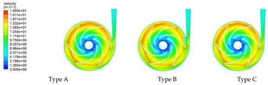 Under this condition, the middle section velocity distribution of the single-tongue volute centrifugal pump and the double-tongue volute centrifugal pump is roughly the same. The impeller passage has a local low-speed region with a small range of zero velocity near the impeller inlet. As the impeller rotates, the internal fluid velocity increases radially along the impeller and reaches a maximum at the junction of the impeller and the volute. In the volute channel, there is a significant velocity gradient between the VIII section and the outlet of the diffusion section, and the small-scale low-speed region at the outlet of some volute structures disappears. In addition, there are different degrees of low-speed regions near the tongue of the five structural types of volutes, and the low-speed region in the B-type volute is larger.