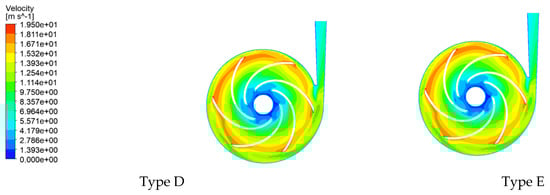 The velocity distribution of the cross-section in the pump at 0.8 Q operating conditions is shown in Figure 11.