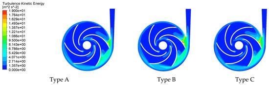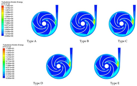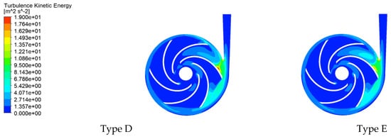 The turbulent kinetic energy distribution of the cross-section in the pump at 0.8 Q operating conditions is shown in Figure 14.