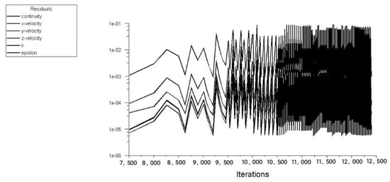 Sliding mesh deals with the coupling between the rotating impeller and stationary volute. The rotational speed of the plastic centrifugal pump is 1450 r/min, that is, 8700 °/s, and the time 0.0003448 s used to rotate the impeller by is selected as a time step. The unsteady numerical calculation simulates the impeller rotation within five weeks after the stable operation of the plastic centrifugal pump and studies and analyzes the results of the last circle, that is, the 481st to 600th time step, the corresponding time is 0.1658488 s to 0.2068800 s []. The maximum number of iterations per time step is limited to 30 steps. The SIMPLE method is still selected, and the other parameters remain unchanged. The residual variation process under the design condition is shown in Figure 18.