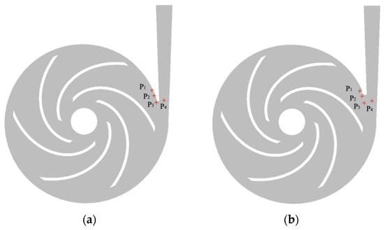 Pressure pulsation monitoring point setting: four pressure pulsation monitoring points, P1, P2, P3, and P4, are set near the tongue of the inner section of the plastic centrifugal pump, as shown in Figure 19, to monitor the pressure values of each point.