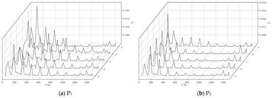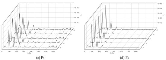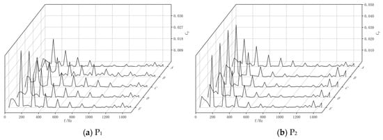 Figure 23 and Table 10 show that the central frequency of pressure pulsation at four monitoring points, P1, P2, P3, and P4, is related to the blades’ pressure pulsation through similar frequencies.