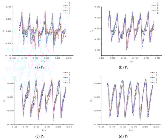 Figure 24 shows that the pressure pulsations at P1, P2, and P3 are more intense at 1.2 Q operating conditions. The pressure pulsations at P1, P2, P3, and P4 for single-tongue worm shells are similar to those at P1, P2, P3, and P4 for double-tongue worm shells. The time domain characteristics of each worm shell at P1, P2, P3, and P4 show a significant periodic variation pattern.