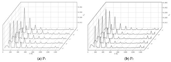 At P1, the primary frequency amplitude of the pressure pulsation of the B and C volute centrifugal pumps decreased significantly compared to that of the single-tongue volute centrifugal pump by 40% and 17%, respectively, while the primary frequency amplitude of the pressure pulsation of the D and E volute centrifugal pumps increased significantly compared to that of the single-tongue volute centrifugal pump, by 3% and 14%, respectively.