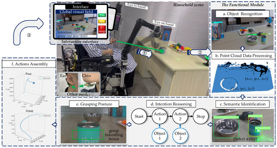 However, the WMRA still faces many problems during use. The traditional control method for electric wheelchairs and robotic arms is through joystick remote control. When performing various household tasks, all degrees of freedom of the electric wheelchair and robotic arm need to be controlled. Therefore, it is challenging to control the WMRA through a joystick, especially for users with a certain degree of disability. Traditional WMRA operation involves many steps and has low human–machine interaction efficiency, which greatly hinders its application.