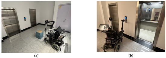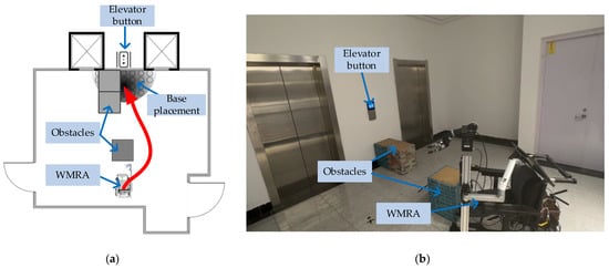 The task of calling the elevator: (a) WMRA starting position; (b) task result for the elevator.