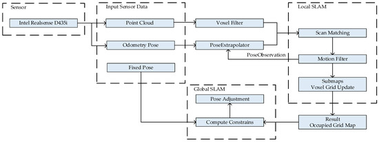 In this study, the Cartographer algorithm [16] was utilized to establish environmental information for a complex task. The algorithm consists of two main components: the front end and the back end. The front end is responsible for handling sensor data to generate initial pose estimates and construct the map, while the back end optimizes the pose estimates and map construction results to achieve greater accuracy. Specifically, the Intel RealSense D435i sensor was employed in the front end to provide point cloud and IMU information, which were fused to estimate the robot’s pose. The front-end point cloud data are used to obtain the initial position of the robot in the environment, followed by camera data to calibrate the robot’s rotational pose and IMU data for position calibration. This approach allowed Cartographer to achieve more accurate pose estimation than a single sensor. In the back end, a graph optimization method was utilized to optimize pose estimates and map construction results.