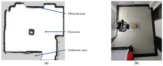 SLAM results: (a) occupied grid map of the elevator room; (b) top view of the actual scene in the elevator room. Each pixel point represents 0.05 m in Figure 5a.