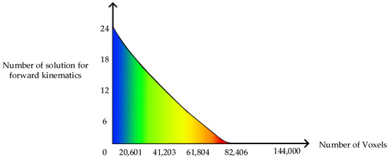 After obtaining 104,658 forward kinematic results, the results are categorized based on the grid partition of the workspace. The number of forward kinematic results associated with each voxel grid unit is examined to determine the number of forward kinematic results per voxel grid unit [19]. The voxel grids that received forward kinematic results are classified and marked with different colors (red, yellow, green, or blue) to represent different numbers of results received. The specific results and classifications are presented in Figure 7.