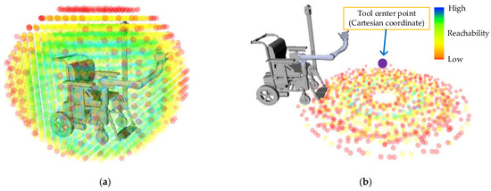 Based on the reachability space description, we obtained the forward kinematics results of the arm for each unit grid at the current base placement. Here, (x, y, z) represents the position of the tool center point relative to the global coordinates, with the global coordinate system centered on the center point of the four wheels of the WMRA, representing the center position of the WMRA. As each pose in the reachability map is a transformation matrix (T) starting from the robot’s origin, we could obtain the grasping ability description of the arm for a certain point in space at different base placements by inverting each forward kinematic transformation matrix and storing it as the IRM. As the mobile base of the armchair robot can only move in SE(2) space, we projected the IRM onto a 2D plane to obtain the IRM facing the mobile base, as shown in Figure 8b.