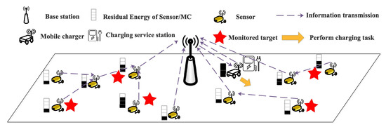 - The MC can visit any position in the network when its remaining energy of MC is greater than and when its remaining energy reaches , it will terminate the current charging operation and return the charging service station to replace the battery;