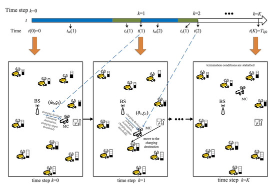 In this paper, MC is assumed to adjust the charging upper threshold adaptively for each sensor according to the charging demand, and the charging operation is triggered at a time step. The index of the time step is defined as k; the maximum time step is K; and the charging policy is defined as , where . represents the charging operation at k-th time step, which includes the charging destination of MC and the charging upper threshold , described as . For the convenience of statistics, we define the index of the charging service station as 0. Thus, .