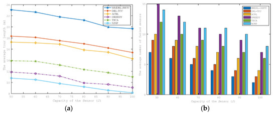 As shown in Figure 7a,b, as the sensor energy capacity gradually increases, the average tour length and the average number of failed sensors decrease gradually. This is because, with the increase of the sensor energy capacity, the initial remaining energy of the sensor will also increase, and the number of sensors with urgent charging demand will decrease accordingly. Thus, within the preset target lifetime 600 s, MC needs to spend more time charging the sensor to its charging upper threshold. Thus, the charging time is prolonged, and the time for MC to move will also be reduced accordingly. Therefore, the average tour length and the average number of failed sensors decrease with the increase in sensor energy capacity.