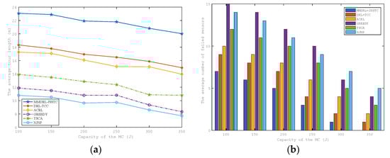 The impact of MC energy capacity on the average tour length and the average number of failed sensors are shown in Figure 8a,b. They have similar trends to those in Figure 7a,b. This is because, as the energy capacity of the MC increases, MC has more operating space to perform charging actions, and more sensors with urgent charging demand can be charged in time to avoid failure in advance. Furthermore, MC can reduce the time to return to the charging service station to replace the battery, thereby effectively reducing the tour length.