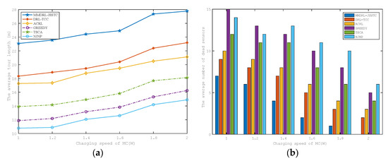 We evaluate the impact of MC moving speed on charging performance in this section, which is shown in Figure 10a,b. They have a trend similar to Figure 9a,b. This is because, with the increased charging speed, the time to move between the charging destinations is effectively shortened, allowing the MC to reach the sensors with more urgent charging demands faster.
