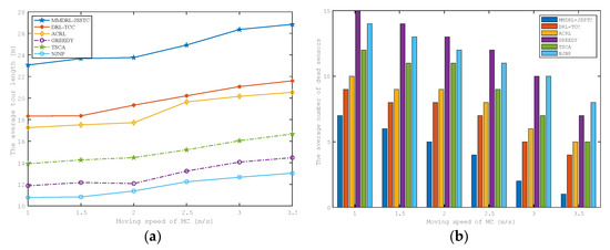 Impact of the MC moving speed on the (a) average tour length (b) average number of failed sensors.