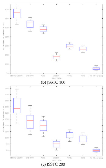The above experiments discuss the impact of different parameter changes on charging performance based on the preset lifetime. This section compares the lifetime distribution of six mobile charging approaches based on different scenarios, including JSSTC50, JSSTC100, and JSSTC200. To compare the impact of different approaches to prolonging the lifetime, we also add the lifetime distribution of the network where the sensors are not charged. In particular, each approach has been run 50 times, and the results are shown in Figure 11.