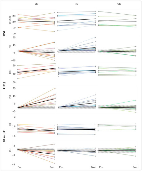 Moreover, the analysis of magnitude-based inferences showed that assuming a small effect, the changes in CMJ performance were highly likely beneficial for both the SG and the HG. This was also true for PSJT, CH, 5 m ST, 10 m ST, and 20 m ST performance, but only in the SG. Concerning RSI performance, the analysis showed that the change was likely beneficial for the HG. Statistical values for jump and speed performances are shown in Table 3, and the individual values of and the percentage changes in the RSI, CMJ, and 10 m ST are presented as examples in Figure 1.