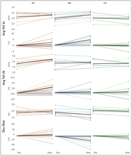 The results of the magnitude-based inferences support the results of the pairwise comparisons by showing that the likelihood that the true magnitude of the effect is beneficial in TT was highest in the SG and the HG. Based on the small effect, the changes in both the HG and SG are highly likely to be beneficial, and the same applies to the Avg Vel 1a of both the SG and HG, while the change in the CG can only be classified as likely beneficial. For Avg Vel 1b, only the change in the SG was classified as highly likely beneficial, while for Dec Dist, the change in the HG was classified as highly likely and that in the CG as likely beneficial. Statistical values regarding CoD performance are shown in Table 4. Moreover, the individual values, as well as the percentage changes, are illustrated in Figure 2 using Avg Vel 1a, Avg Vel 1b, and Dec Dist as examples.