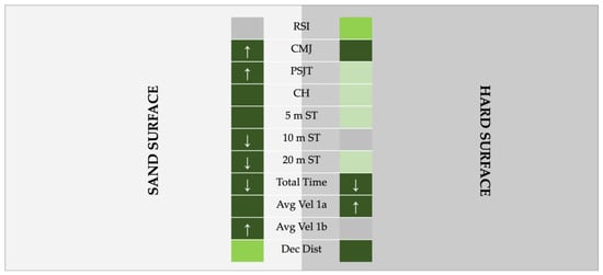 The results of this study revealed that some of the jump and speed performance parameters improved significantly in the SG. Specifically, the SG showed significant improvements in CMJ, PSJT, 10 m ST, and 20 m ST performance from pre- to post-intervention. Moreover, both the HG and the SG showed improvements in CoD performance. However, a more detailed analysis shows that only the HG improved in Avg Vel 1a, while Avg Vel 1b only improved in the SG. These findings suggest that sand could be an effective training surface to improve jumping, sprinting, and CoD performance.