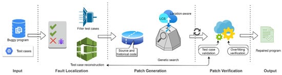 - Goues, C.L.; Dewey-Vogt, M.; Forrest, S.; Weimer, W. A systematic study of automated program repair: Fixing 55 out of 105 bugs for $8 each. In Proceedings of the 34th International Conference on Software Engineering, Zurich, Switzerland, 2–9 June 2012; IEEE: Piscataway, NJ, USA, 2012; pp. 3–13. [Google Scholar]