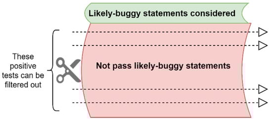 Figure 3 shows the test filtering process, which is used to speed up patch verification. During the process of fault localization, we record all the code line numbers covered by the test case during its execution. If a positive test case does not pass likely-buggy statements that may include bugs in fault localization, this positive test case is most probably not related to this bug statement. Therefore, this positive test case can be filtered out during the patch verification process. This approach can significantly accelerate the evaluation of patch candidates during the patch repair process.