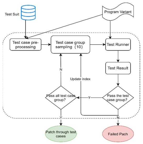 Figure 4 shows the test case prioritization process. The test cases are divided into 10 groups, and the sorted test cases make it easier to identify invalid patches. The test cases are divided into 5 to 20 groups. Experimental tests showed that the most effective results could be obtained when the test cases were divided into 10 groups. If all the test cases pass, the variant is a trusted patch and enters patch overfitting verification. If the
