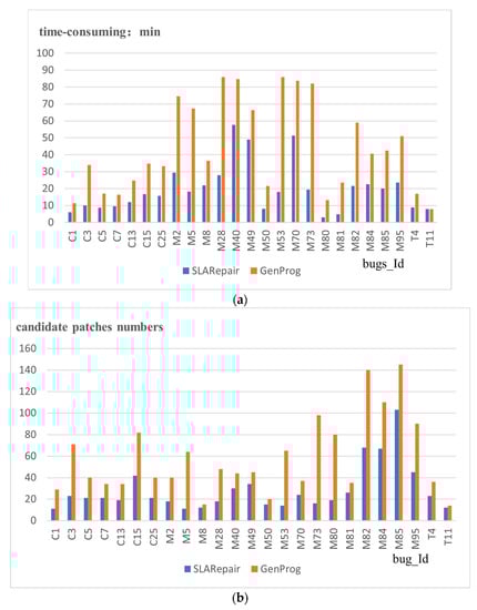 Figure 7. The main reasons are threefold. The first point is that SLARepair combines code similarity to guide the repair process, while Genprog uses only genetic programming. Genetic programming randomly selects repair ingredients, which, when combined with code similarity, allows for a more efficient selection of suitable repair ingredients. The second point is that the location-awareness strategy makes it easier for SLARepair to find the correct patch. The improvement of the repair ability is verified after the location-awareness strategy subdivides the search space from