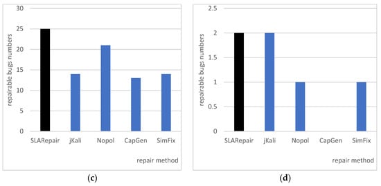 Figure 9d that in the Time project, SLARepair and jKali can repair two bugs, while the remaining three repair methods can only repair one at most. This is because the Time project is too complex, resulting in a small number of repairable faults in the existing repair methods. As shown in