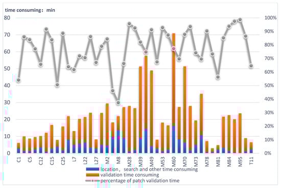 Figure 10 shows the time-consumption situation of SLARepair’s patch verification on 43 repairable bugs. The horizontal axis represents the bug Id, the main vertical axis represents time (unit: minutes), and the secondary vertical axis represents the percentage of patch verification in the total repair time. It can be seen from