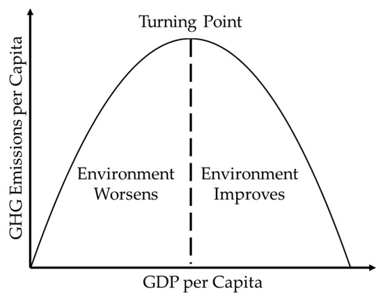 Recently, Marotta et al. analysed various factors that influence GHGs emissions. For example, a study on the built environment [20] correlates GDP growth (economic dimension) with GHG emissions and renewable energy use (environmental dimension), based on the concept of the environmental Kuznets curve (EKC) hypothesis about the nonlinear relationship between economic growth and environmental degradation as shown in Figure 1.