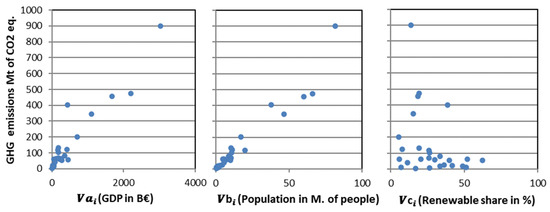 First, the independent variables (i.e., GDP “a”, population “b” and RES “c”) are weighted on a scale between 0 and 1, using Equation (1), so they can be compared on the same value scale. In total, 108 weighting values are obtained. Subsequently, the relation between the calculated weighting values () and the amount of GHGs released into the atmosphere is explored.