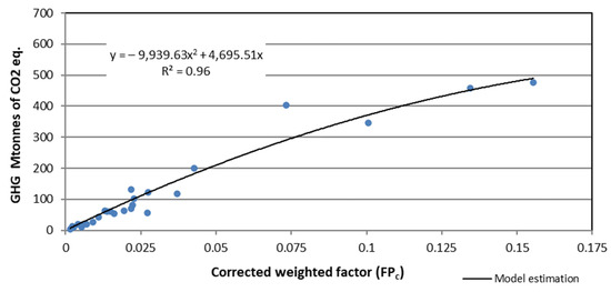 The correlation between the amount of GHG emissions generated and the corrected weighted factor (FPc) of the MS is shown in Figure 3. Thus, the final equation for GHG emissions estimation (Equation (9)) is established, aiming to estimate the amount of GHG emissions generated () in an MS (i), once the corrected weighted factor (FPc) of the MS is calculated (Equation (9)):