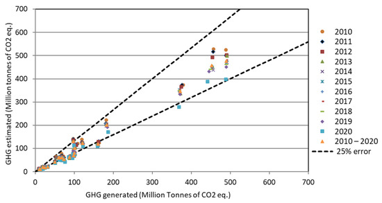Finally, the amounts estimated with the multifactor equation are compared with the data reported to Eurostat for each single year from 2010 to 2020. For this, the relation between the amount of GHG emissions generation reported to Eurostat by each EU MS and the amount estimated with the multifactor equation are shown in Figure 4.