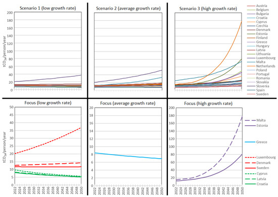The results of scenario 3 (high growth rate) show a strong increase in GHG emissions for all EU MSs, especially for Estonia and Malta, mainly due to a strong GDP growth (>13%) that is not supported by sound policies to reduce environmental impacts. Estonia has opted for feed-in tariff models only, which means that private and commercial companies can sell green electricity to their domestic energy markets, but this does not encourage the adoption of RES [47]. As for Malta, the deep waters around the coast hardly allow for conventional offshore wind energy, while onshore wind energy and ground-based photovoltaic parks are not compatible with the high population density and limited availability of open land [49]. One solution could be the implementation of offshore photovoltaics and wave energy converters (WECs), but policy makers are required to introduce more consistent support mechanisms such as grant programs to spread the practice [50].