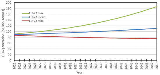 Figure 6 shows the average GHG emissions for the twenty-three EU MSs (without Germany, France, Italy and Ireland) for each year until 2050. Results show that GHG emissions generation increases in two scenarios, when the growing trend is high or kept as an average. In particular, the highest increase is achieved in scenario EU-23 max.—rising around 104% by 2050 compared to the year 2022. An average growth will result in a GHG emissions increase of around 24%, while a low growing rate can reduce the GHG emissions up to 14% compared to 2022.