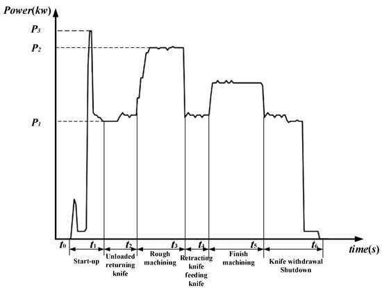 Workshop energy consumption comprises machine tool energy consumption and transportation energy consumption. In Figure 1, which represents a simplified model of the input power of a machine tool during the machining process [23], the energy consumption of a single piece of equipment can be divided into four states: starting state, processing state, no-load state, and stop state. During equipment start-up and shut-down, there is a significant fluctuation in power, but the duration is short. Frequent start–stop operations can negatively impact the machine’s lifespan and processing quality. Typically, a machine performs only one start–stop operation, which is not the primary factor affecting energy consumption. Hence, it is not considered in the model. Consequently, only the processing state and no-load state of a single equipment are taken into account when considering energy consumption.