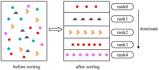 The non-dominated crowding ranking method is used to calculate the level of individuals, stratify them, and calculate the crowding degree between individuals at the same level. This realizes the preservation of optimal solutions and elimination of inferior solutions for wolf packs, allowing wolf packs to update the position of artificial wolves during the iteration process. The non-dominated sorting is shown in Figure 3.