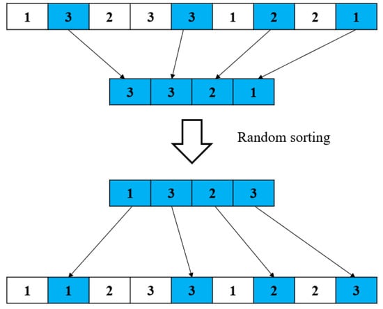 Wandering behavior: take the process wandering and machine wandering in two ways. For wandering walking, as shown in Figure 4, first, according to the process code, the walking step length is defined as the number of individual position vectors for the detection wolf to walk, process codes containing different workpieces are randomly extracted, randomly sorted, and then the sorted codes are placed in the spare position of the original process code in order.