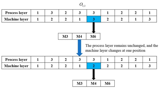 The first row of the table represents the process order, where the number represents the name of the workpiece and the number of times it appears represents the process of the workpiece. For example, if “1” means workpiece 1, the first occurrence of “1” means the first process of workpiece 1, and the second occurrence of “1” means the second process of workpiece 1, and so on. The second row is the machine selection problem for the machining process. The machines that can be processed by each machining process correspond to a set of machines, and each number indicates the index of the location of its machine set. For example, the processing machine set for process is ( and denote machine 2 and machine 4, respectively), and 2 means that its processing machine is the second position in the machine set, which is , indicating that process is processed on machine 4.