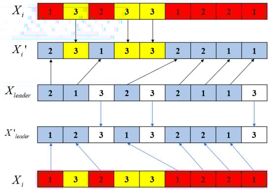 (2) Calling behavior. The wolf pack is ranked using the non-dominated crowding degree ranking method, and one of the solution sets is randomly selected from the optimal Pareto solution set as Xleader. The POX crossover operation is then performed as follows: the workpiece serial numbers are randomly assigned to two non-empty and complementary sets Q1 and Q2, the workpiece serial numbers containing the set Q1 are selected from the parent X1, the position of each workpiece serial number is kept unchanged, and copied to the child X1’. The set Q2 workpiece serial numbers are selected from the parent Xleader, and these are inserted to the vacant positions of the child X1’ in order. Similarly, the workpiece serial numbers from the parent Xleader containing the set Q1 are selected, while the position of each workpiece serial number is kept unchanged, and then copied to the child Xleader’. The set Q2 workpiece serial numbers from the parent X1 are selected and inserted into the vacant positions of the child Xleader’, in order. The POX crossover operation is shown in Figure 6.