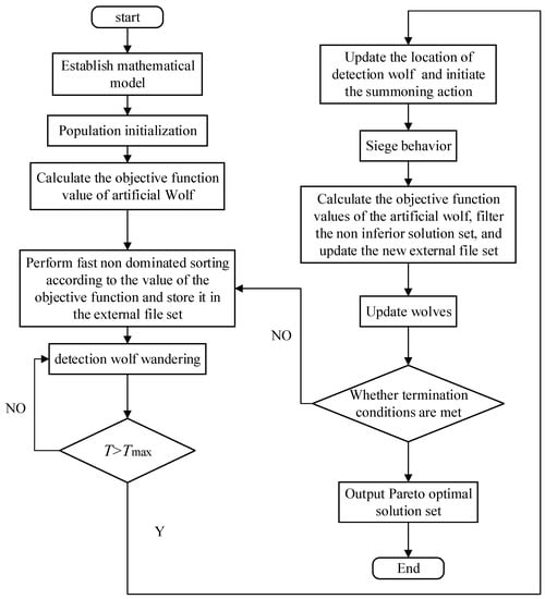 Step 2: Set the external file , calculate the objective function value of each artificial wolf in the initial population, layer the individuals through rapid non-dominated sorting, and update the external files set.