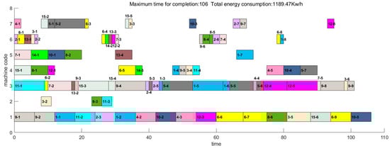 The larger the value of R, the better the effect of the corresponding solution under this weight. From the correlation matrix R, it can be seen that the 11th group of data has the largest correlation of 0.778, which corresponds to a maximum completion time of 106 and a total shop floor energy consumption of 1189.47. Therefore, the scheduling solution corresponding to the 11th group of scheduling optimization results is selected for processing, and its scheduling Gantt chart is shown in Figure 8.