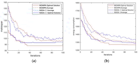 Figure 9 illustrates the population iteration diagram of the maximum completion time and total energy consumption values obtained using the MOWPA algorithm and the NSGA-II algorithm with MK04 data. In Figure 9a, which displays the population iterations for the maximum completion time, the red solid and dashed lines represent the optimal and average values, respectively, obtained by the MOWPA algorithm. Similarly, the blue solid and dashed lines represent the optimal and average values, respectively, obtained by the NSGA-II algorithm. The MOWPA algorithm achieves a stable optimal maximum completion time after approximately 35 generations, while the NSGA-II algorithm achieves this after around 25 generations. Although the MOWPA algorithm has a slower convergence rate compared to the NSGA-II algorithm, it provides better solution accuracy. Figure 9b represents the population iteration diagram for total energy consumption. The red solid line and dotted line correspond to the optimal and average values, respectively, obtained by the MOWPA algorithm. Similarly, the blue solid line and dotted line represent the optimal and average values, respectively, obtained by the NSGA-II algorithm. The MOWPA algorithm maintains a stable optimal solution around 52 generations, whereas the NSGA-II algorithm exhibits more fluctuation. Overall, the MOWPA algorithm demonstrates superior speed and precision compared to the NSGA-II algorithm in terms of both maximum completion time and total energy consumption.