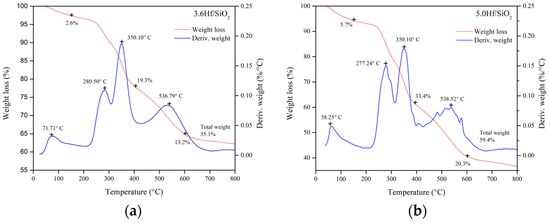 Thermal analysis of synthesized materials: (a) 3.6Hf/SiO2, (b) 5.0Hf/SiO2.
