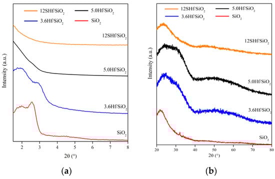 X-ray diffraction patterns at low angles are shown in Figure 2a. The pure material (SiO2) shows a signal at 2.5° on the 2-theta scale (associated with the 100 plane) that characterizes a hexagonal arrangement similar to that reported for a mesoporous material of the M41S family [20], while for the 3.6Hf/SiO2 material a broad peak is observed in the range of 1.5–3° on the 2 theta scale attributed to a poorly ordered structural arrangement. The structural arrangement observed in SiO2 and 3.6Hf/SiO2 collapses when these materials are impregnated with 12 wt.% sulfate ions and when a higher hafnium atom loading is added to SiO2 in the synthesis step. On the other hand, Figure 2b, diffraction patterns between 20 and 80° on the 2-theta scale, shows hafnium-modified silicates with a broad peak at ~21° on the 2-theta scale, which characterizes an amorphous SiO2, additionally for pure silicate a peak at 31° on the 2-theta scale was observed, which corresponds to amorphous silica [23]. The Incorporation of Hf and on pure SiO2 promotes a decrease in peak intensity and broadening of said peak, attributed to the homogeneous incorporation of HfO2 in the silicate structure since no signal of the metal oxide is identified. On the other hand, this behavior can also be attributed to the calcination temperature used, which prevented the formation of the crystalline phase of hafnium. Kim and Yong [24] reported that the crystalline structure formation of HfO2 requires calcination temperatures over 900 °C.