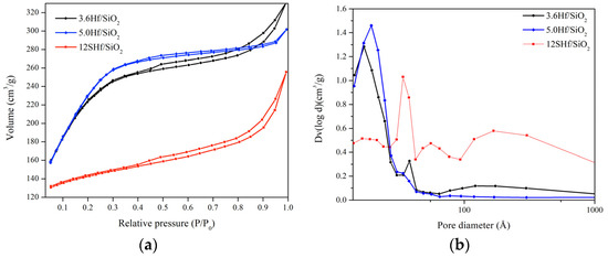 Figure 3a shows nitrogen adsorption-desorption isotherms of the hafnium and sulfate ion-modified silicates. The 3.6Hf/SiO2 and 5.0Hf/SiO2 materials exhibit type-IV adsorption isotherms, confirming the mesoporosity of the solids [25], with pore sizes about 20–22 Å (Figure 3b). The presence of sulfate ions in the 12SHf/SiO2 material caused a change in the isotherm type to type III, which characterizes non-porous or macroporous solids with an average pore diameter around 64 Å. The increase in the average pore diameter is due to the destruction of the porous wall by the presence of sulfuric acid H2SO4, used as a source of ions for the material. On the one hand, the acid strength of the catalyst increased, but as a result, the silicate structural arrangement collapsed, as observed in the X-ray diffractogram in Figure 2a.